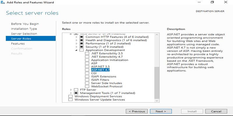 بخش Server Roles همان قسمتی است که شما باید از کادر Roles گزینه Application Development را پیدا کرده و از میان زیر گزینه های آن ASP.NET 4.7 یا ASP.NET 3.5 را انتخاب کنید و بر روی Next کلیک کنید.